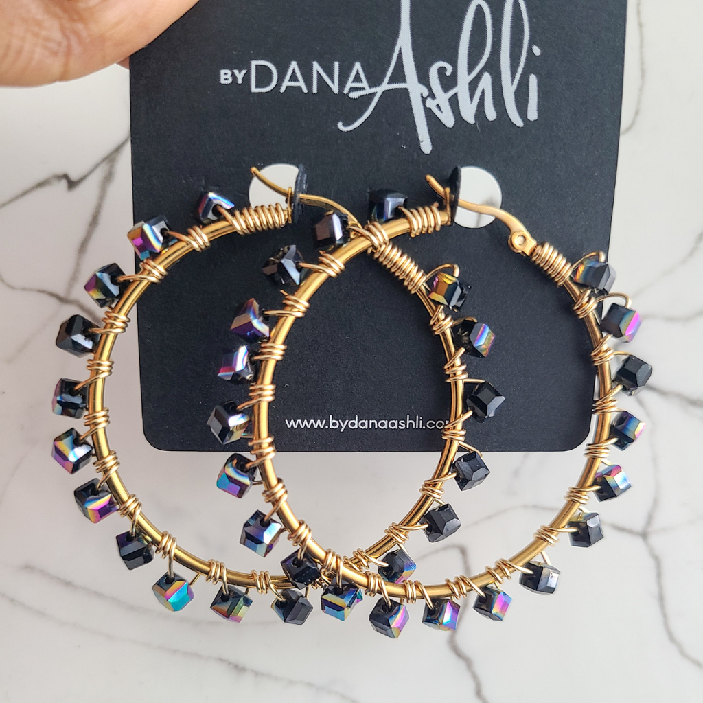 Gold hoops with individually hand wire wrapped black oil slick square crystals.