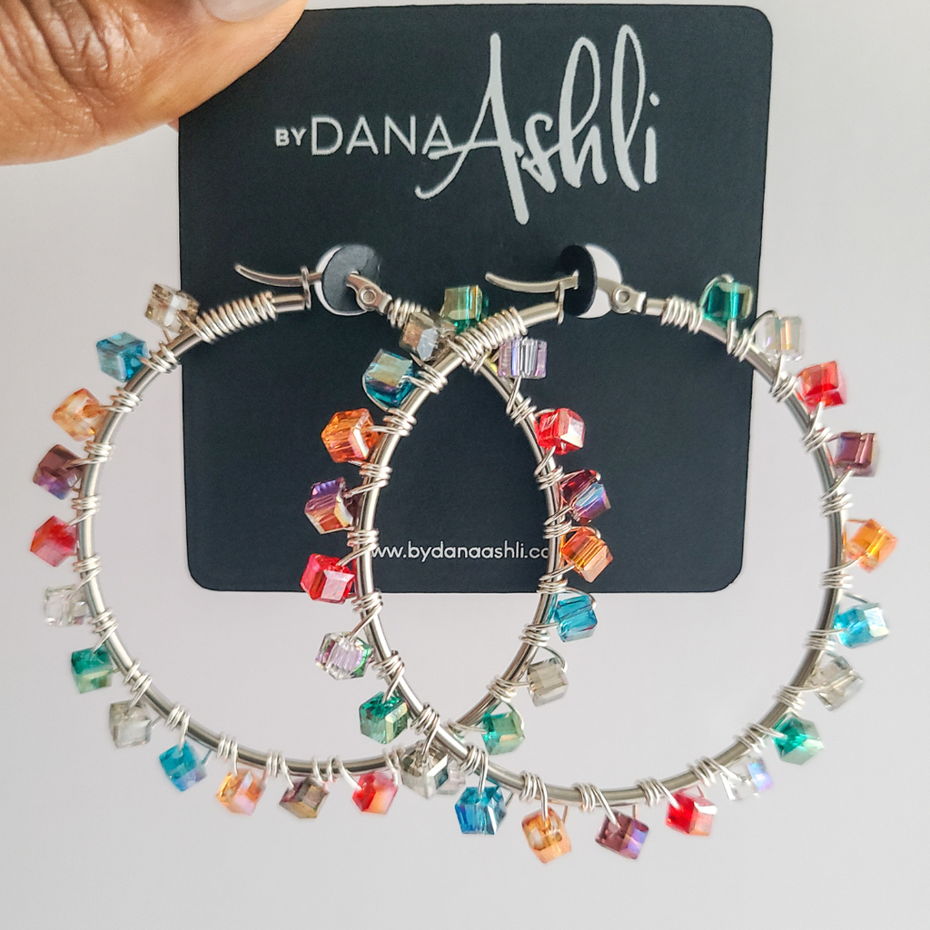 Silver hoops with individually hand wire wrapped multi colored square crystals. Only one pair available in this colorway.