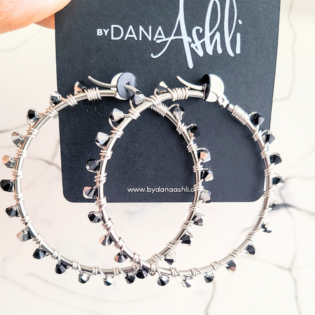 Silver hoops with individually hand wire wrapped black and silver crystals.