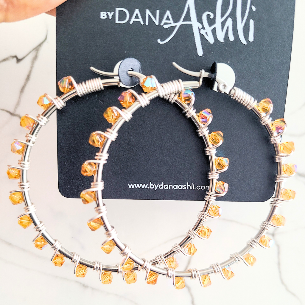 Silver hoops with individually hand wire wrapped marigold crystals.