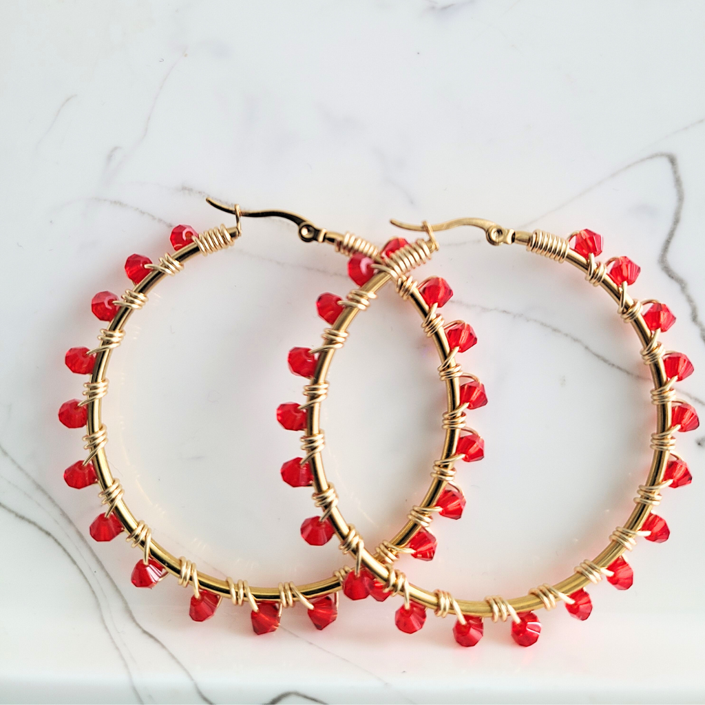 Gold hoops with individually hand wire wrapped red crystals.