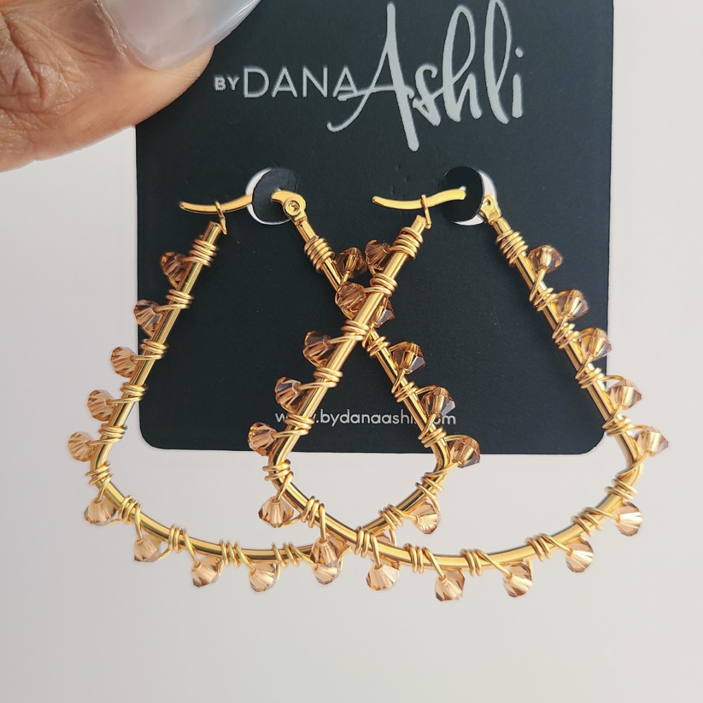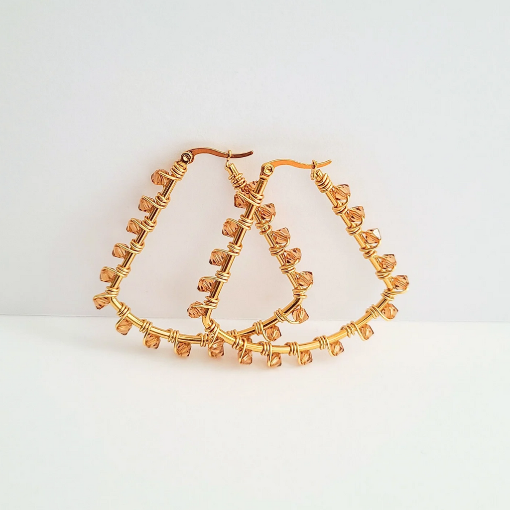 Gold fan shaped triangle hoops with individually hand wire wrapped topaz crystals.