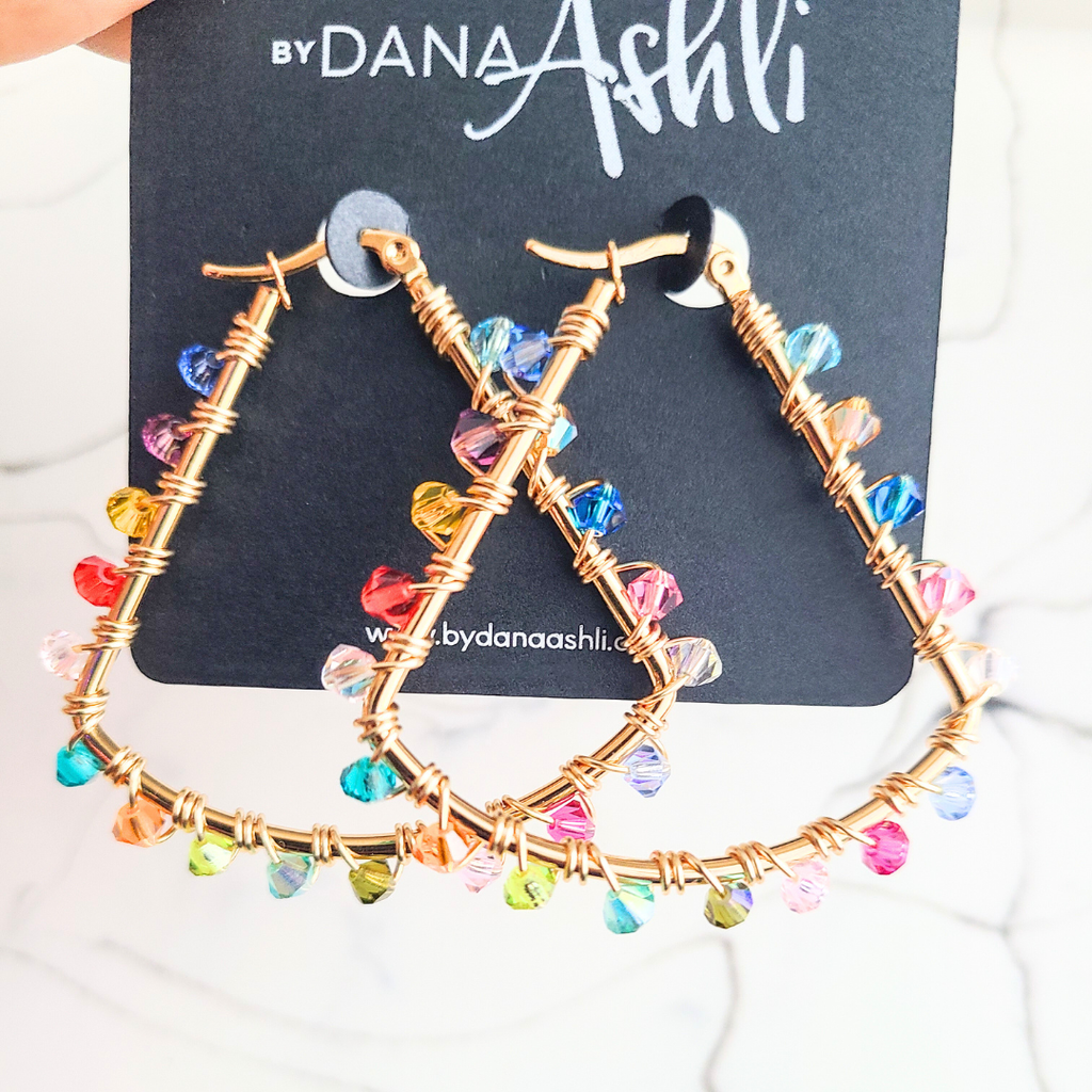 Gold fan shaped triangle hoops with individually hand wire wrapped multicolored crystals.